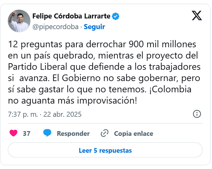 “Doce preguntas que podrían costarle al país lo que no tiene. “¡Colombia no aguanta más improvisación!”, declaró Córdoba, quien señaló que el Gobierno parece más enfocado en gastar que en gobernar con eficiencia.