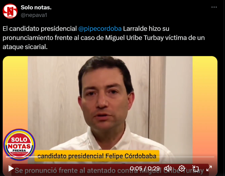 “Rechazo totalmente el acto de hoy. El atentado contra @MiguelUribeT es una muestra clara de que Colombia no puede seguir viviendo con estos hechos. Toda mi solidaridad con él, su esposa y sus hijos. Que Dios y la Virgen María le protejan la vida.”